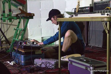 The final act of the festival was one of only two musicians performing that does not currently reside in the Kansas City or Lawrence region. Bloomington, IN, native Dylan Ettinger finished out a relatively psych-free evening with one final blast of ’80s influenced synth pop. The bespectacled Ettinger stood over a folding table covered in keyboards, synths and other tools with which to modify and skew the sound he created. His approach taken to the subgenre was simplistic at most, but at the end of it all, a mind-melting set of complexity wasn’t really what I or the crowd wanted. What they did want, though, was more saxophone. The set was opened with a sax player standing to Ettinger’s right, but through most of what followed he enthusiastically danced along to the music while still behind his mic stand. A group of people started to yell out “Pump up the sax!” until he finally made another appearance, and it certainly ended the night on a high note.